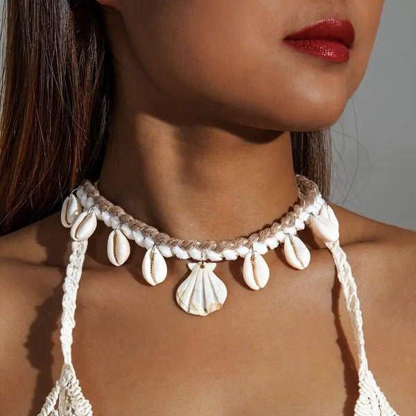 SC :1 Collier Bohème Chic Tressé à la Main avec Pendentif en Coquille Saint-Jacques - Alliage, Idéal pour les Fêtes à la Plage et les Cadeaux, Bijoux de Vacances d'Été, Accessoire de Vacances | Style Bohème Chic | Collier en Corde Tressée à la Main