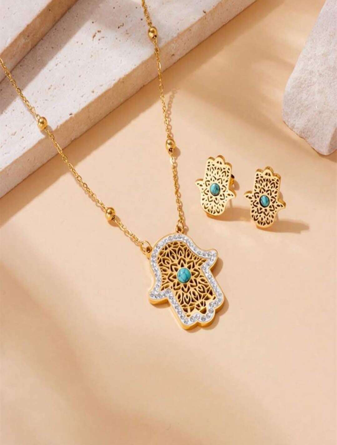 1set Collier pendentif en acier inoxydable plaqué or avec fleur creuse, turquoise et boucles d'oreilles assorties en bijoux